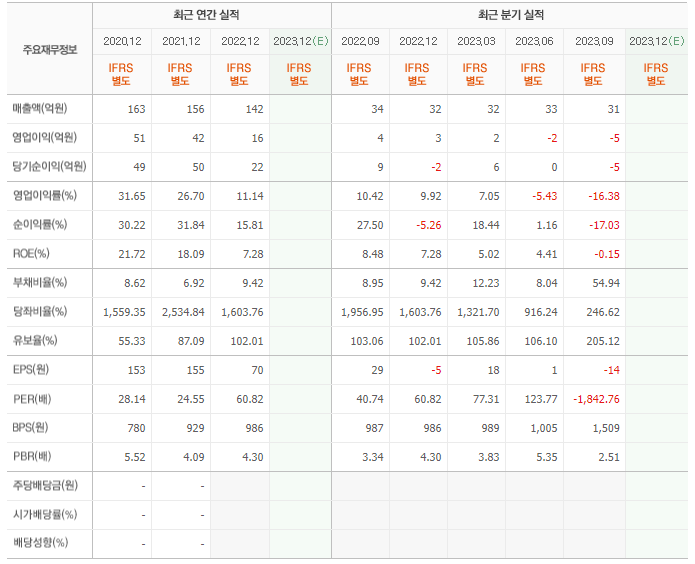 2022년 매출은 142억, 영업이익은 16억, 당기순이익은 22억입니다. 그리고 영업이익률은 11.14%입니다.