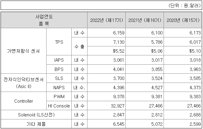 당사는 센서전문기업으로서 인쇄전자기술, 전자기응용기술, 열영상 적외선 기술 등을 보유하여 엑셀, 브레이크 페달 센서, 적외선 열영상 센서 및 모듈 등을 개발, 제조 및 공급하는 업체입니다. 자동차(자율주행차 및 친환경차 HEV/EV)에 적용되는 APS (Accelrator Pedal Sensor), BPS(Brake  Pedal Sensor), SLS(Stop Lamp Switch)를 자동차 1차 Vendor를 고객으로 공급 중에 있으며, 적외선 열영상 센서 및 카메라의 수요시장 증가로 공급량이 빠르게 증가하고 있습니다.