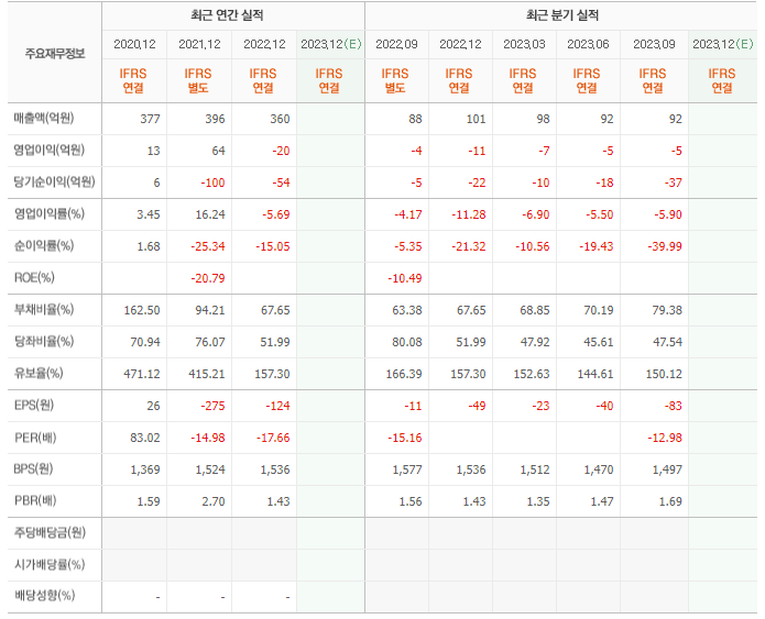 2022년 매출은 360억, 영업이익은 -20억, 당기순이익은 -54억입니다. 그리고 영업이익률은 -5.69%입니다.