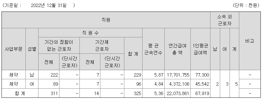 남성의 평균연봉은 7730만원이고 직원수는 229명, 여성은 4554만원이고 직원수는 96명입니다. 전체 평균연봉은 6791만원이고 직원수는 325명입니다.