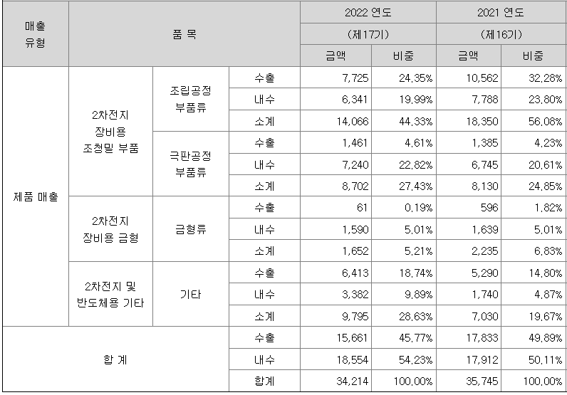 당사는 다양한 제품군을 보유하고 있으며, 주요 제품으로 극판 공정 장비에 사용되는 PX-SHAFT 및 KNIFE UNIT과 KNIFE-SPACER, 조립 공정 장비에 사용되는 권심, CUTTER와 초음파 혼,ANVIL, 절연판 금형 등을 생산하고 있습니다.