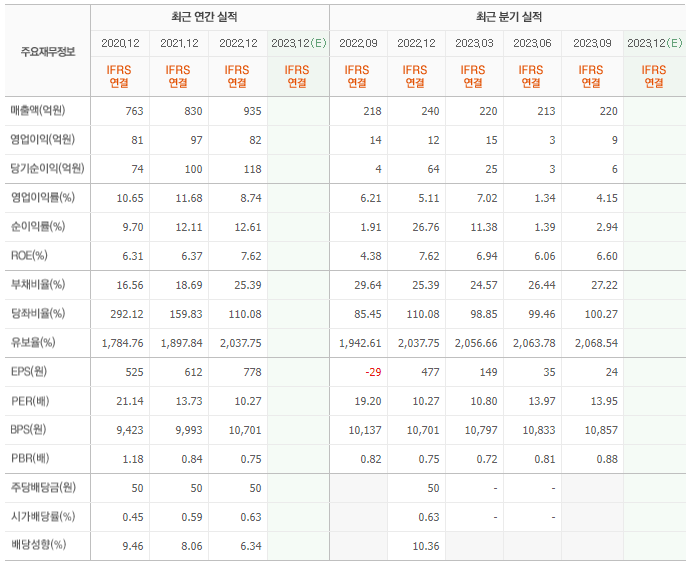2022년 매출은 935억, 영업이익은 82억, 당기순이익은 118억입니다. 그리고 영업이익률은 8.74%입니다.