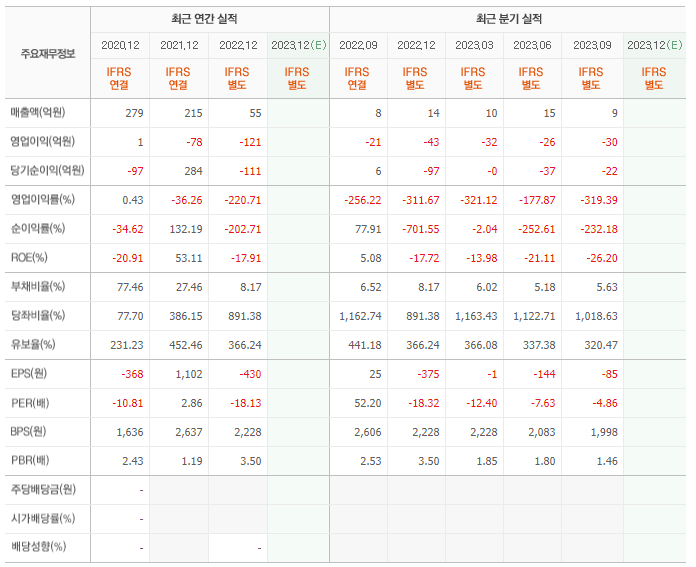 2022년 매출은 55억, 영업이익은 -121억, 당기순이익은 -111억입니다. 그리고 영업이익률은 -220.71%입니다.