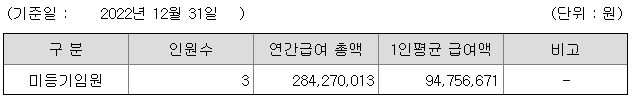 미등기임원의 평균연봉은 9475만원이고 직원수는 3명입니다.