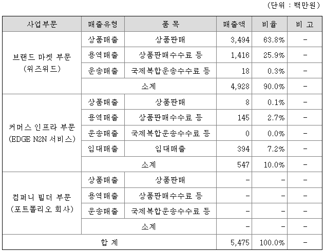 당사는 해외 수입 대행 및 국내 업체들의 입점을 통한 전자 상거래(E Commerce, Mobile Commerce, Smart TV Commerce)사이트인 WizWid사업을 운영하고 있습니다. 주력 사업모델인 WizWid를 중심으로 회사는 수익을 창출하는 재화와 용역의 성격, 시장 및 서비스 제공 방법의 특징, 각 사업 부문의 투자와 계속성 등을 고려한 영업 부문별 경영성과를 적절히 반영하기 위해 브랜드마켓, 커머스 인프라 사업, 컴퍼니 빌더 사업부문으로 세분화하였습니다.