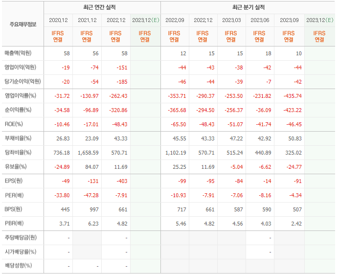 2022년 매출은 58억, 영업이익은 -151억, 당기순이익은 -185억입니다. 그리고 영업이익률은 -262.43%입니다.