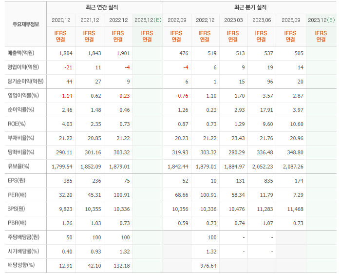 2022년 매출은 1901억, 영업이익은 -4억, 당기순이익은 9억입니다. 그리고 영업이익률은 -0.23%입니다.