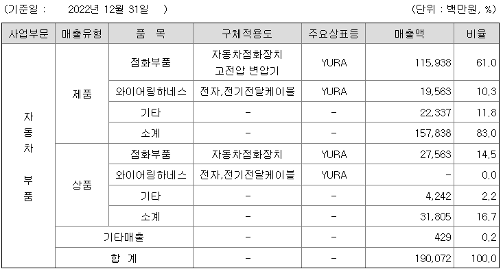당사는 자동차 점화장치부품을 생산ㆍ판매하고 있으며, 각 제품 및 상품 매출액이 총매출액에서 차지하는 비율은 다음과 같습니다.