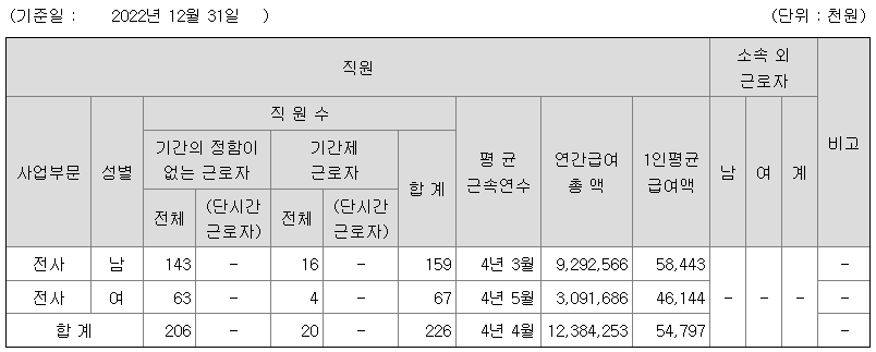 남성의 평균연봉은 5844만원이고 직원수는 159명, 여성은 4614만원이고 직원수는 67명입니다. 전체 평균연봉은 5479만원이고 직원수는 226명입니다.