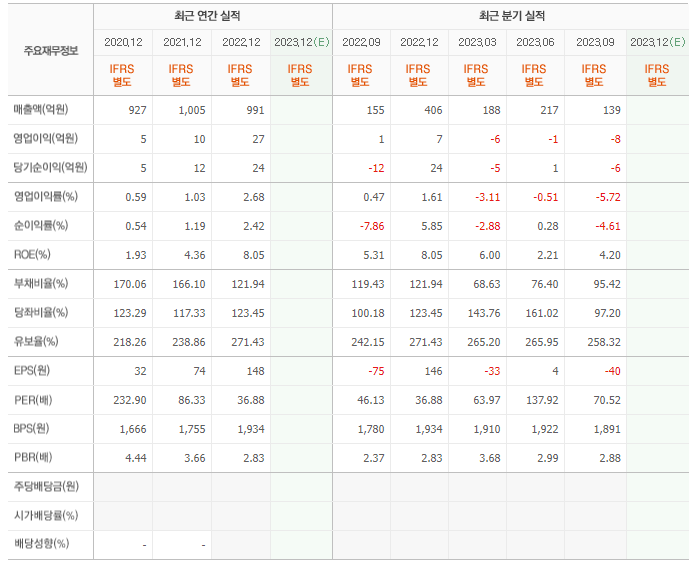 2022년 매출은 991억, 영업이익은 27억, 당기순이익은 24억입니다. 그리고 영업이익률은 2.68%입니다.