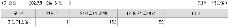 미등기임원의 평균연봉은 1억 5200만원이고 직원수는 1명입니다.