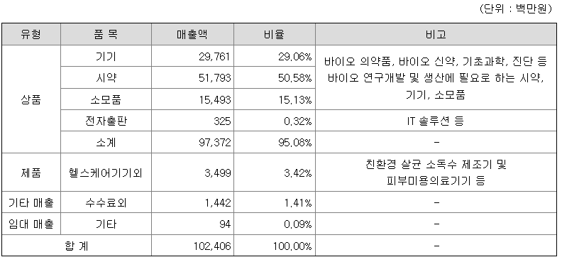 당사는 국내 바이오기업 및 제약사, 국가연구기관, 대학, 연구소, 병원 등에 바이오 산업의 연구개발 및 생산에 필요한 시약, 기기, 소모품 등을 공급하고 있습니다.