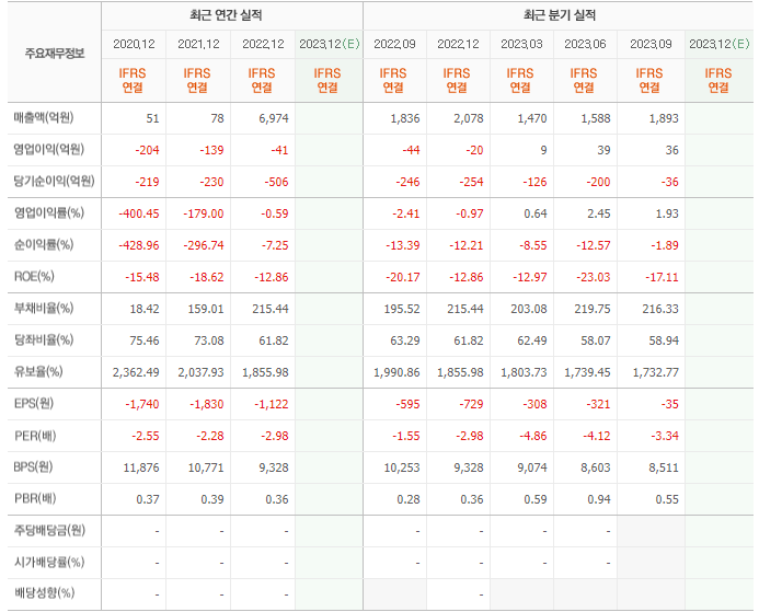 2022년 매출은 6974억, 영업이익은 -41억, 당기순이익은 -506억입니다. 그리고 영업이익률은 -0.59%입니다.