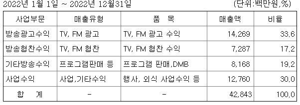 회사의 시장점유율은 2020년까지는 한국방송광고공사에서 매월 공표하는 지상파 방송광고 판매 총액을 기준으로 작성하여 왔습니다. 그러나「방송광고판매대행에관한법률」의 제정으로 한국방송광고공사의 영업 독점이 해제되어, 더 이상 방송광고 매출 자료를 공표하지 않으므로 시청률 자료(라디오 청취율 제외)를 시장점유율을 산출하기 위한 자료로 활용하겠습니다.