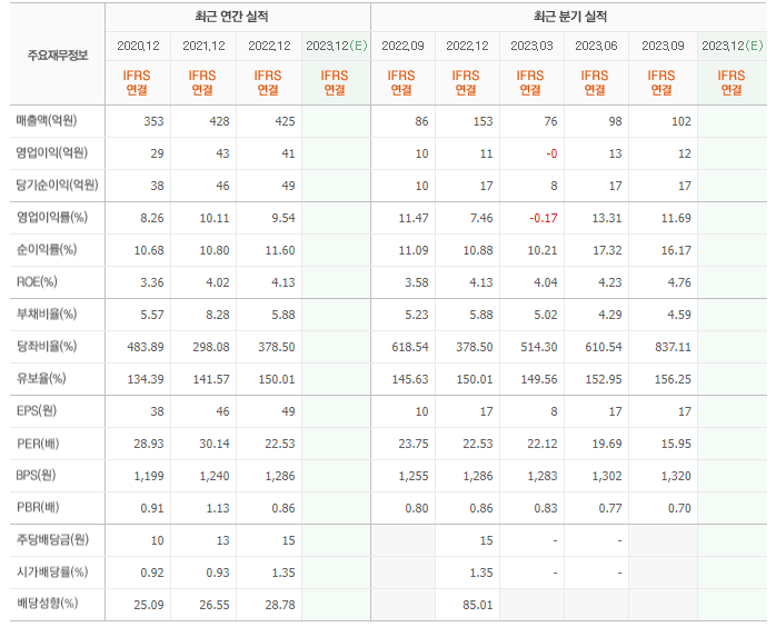 2022년 매출은 425억, 영업이익은 41억, 당기순이익은 49억입니다. 그리고 영업이익률은 9.54%입니다.