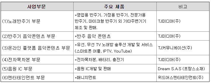 당사는 노래반주기, 음악콘텐츠, 전자목차본(전자인덱스), 음원 IC, 엔터테인먼트 사업을 영위하고 있습니다. 1981년 태진음향으로 출발하였으며, 1997년 태진미디어로 상호 변경 후 같은해 4월에 코스닥 시장에 상장하였습니다. 이후 2005년 현재 사명인 'TJ미디어'로 상호를 변경하였습니다.