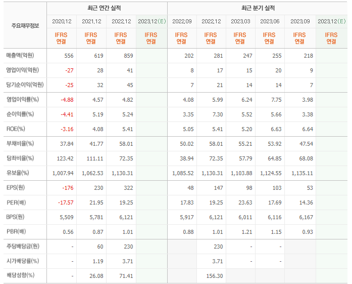 2022년 매출은 859억, 영업이익은 41억, 당기순이익은 45억입니다. 그리고 영업이익률은 4.82%입니다.