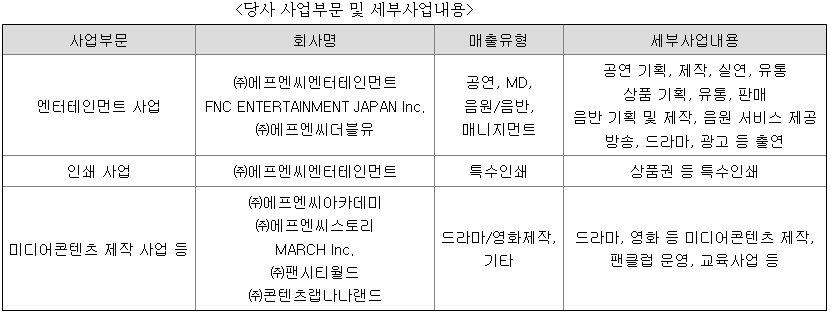 당사의 사업부문은 엔터테인먼트 사업, 인쇄 사업, 미디어콘텐츠 제작 사업 등으로 나누어 볼 수 있습니다.