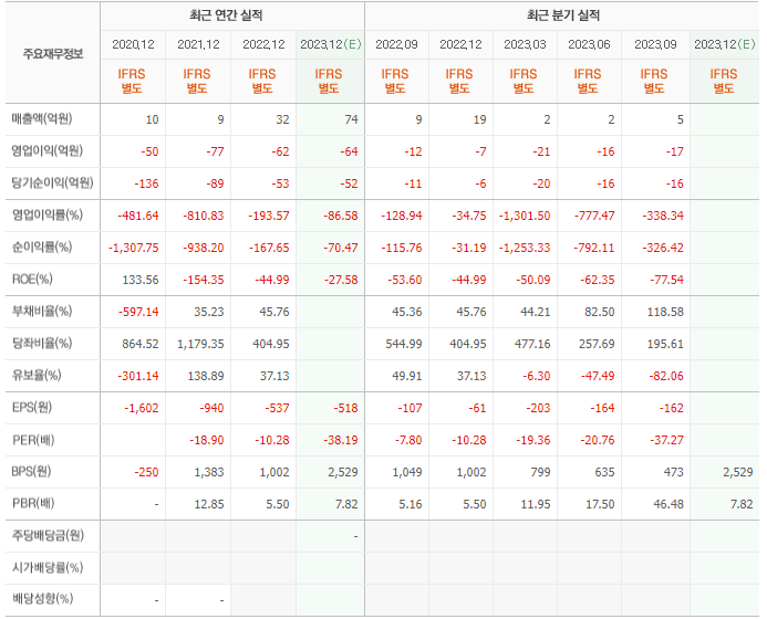 2022년 매출은 32억, 영업이익은 -62억, 당기순이익은 -53억입니다. 그리고 영업이익률은 -193.57%입니다.