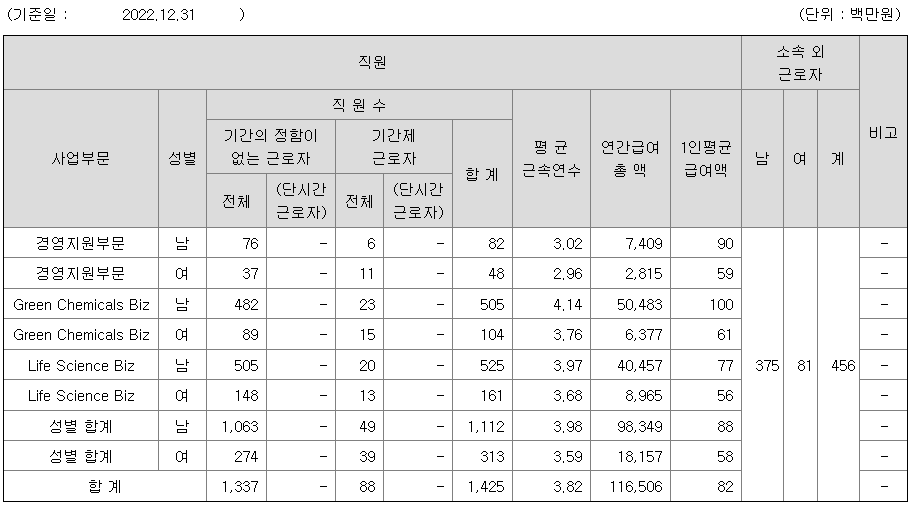 | 사업부문 | 성별 | 직원수 | 평균근속연수 | 평균연봉(백만) |