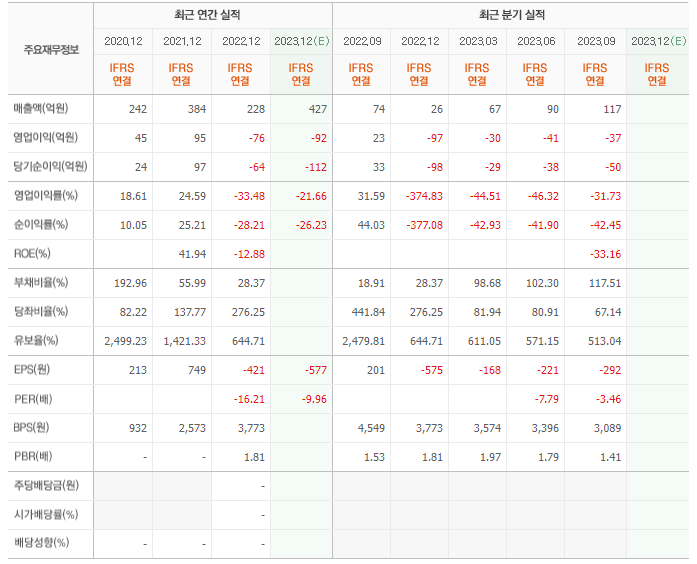 2022년 매출은 228억, 영업이익은 -76억, 당기순이익은 -64억입니다. 그리고 영업이익률은 -33.48%입니다.