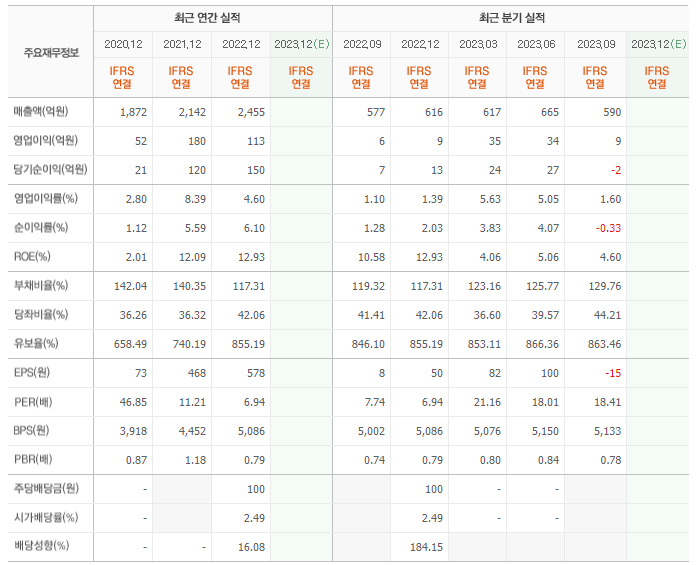 2022년 매출은 2455억, 영업이익은 113억, 당기순이익은 150억입니다. 그리고 영업이익률은 4.60%입니다.