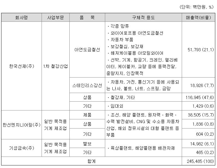 당사는 건설, 조선, 기계, 부품등에 사용되는 아연도금철선 및 스테인리스강선, 철강재를 생산, 판매 하고 있으며, 종속회사인 한선엔지니어링(주)는 조선, 해양 플랜트, 원자력ㆍ화력ㆍ수력 발전설비 등 고가의 장비 또는 설비의 핵심부품으로 사용되는 제품인 계장용 Fitting 및 Valve를 생산, 판매하고, 기성금속(주)는 정유플랜트, 담수화플랜트 등 육상플랜트 및 해양플랜트용 배관자재 Valve를 생산판매하고 있으며, 각 제품별 매출액 및 총매출액에서 차지하는 비율은 다음과 같습니다.