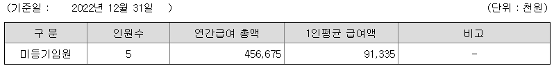 미등기임원의 평균연봉은 9133만원이고 직원수는 5명입니다.