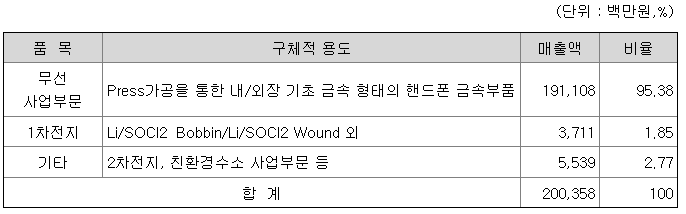 당사는 핸드폰 내장재 및 외장재 및 1차리튬전지, 2차전지 금속부품 제조 및 판매, 이산화탄소재활용 사업을 영위하고 있으며 매출액 및 총 매출액에서 차지하는 비율은 다음과 같습니다.