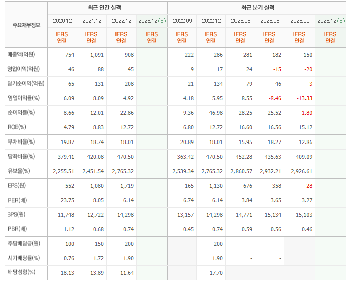 2022년 매출은 908억, 영업이익은 45억, 당기순이익은 208억입니다. 그리고 영업이익률은 4.92%입니다.