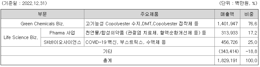 당사의 Green Chemicals Biz.는 Copolyester 수지, 접착 및 코팅제 등 고객 니즈에 따른 차별화된 제품을 제공하고 있습니다. Life Science Biz.는 제약 사업(Pharma 사업)과 백신 사업(SK바이오사이언스) 등 2개 분야에서 헬스케어 사업을 전개하고 있습니다. 당기 사업별 매출액 및 매출 비중은 아래와 같습니다.