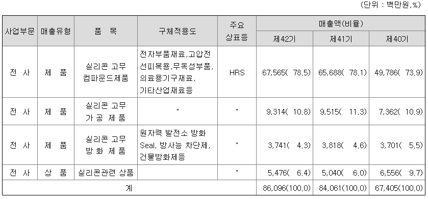 당사는 실리콘고무제품 제조 단일사업을 영위하고 있습니다. 실리콘고무는 전기전자(LCD/LED부품,방열제품,OA,키패드등)와 생활용품(밀폐용기 패킹등), 전기.전력발전소분야(고압애자,고압전선 Cable 보호코팅, 변전소및 각종건물빌딩의 방화구획/밀폐재,원자력발전소 방화및 방사능 차단재), 자동차(자동차 Ignition Cable및 Sparkplug boot, 라디에이터 호스,Sunroof 가스켓, 전기자동차 케이블등), 레저스포츠(수영모자,골프장갑,스키장갑코팅등), 의료용(의료수술용Hose, 산소 호흡기,골절보호대,치과용인상재등), 친환경 주방용품등 산업전반에 널리 사용되고 있습니다.