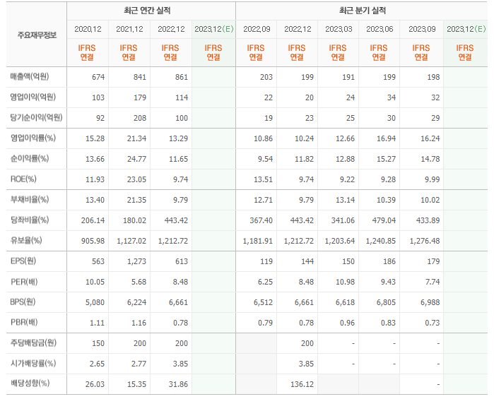 2022년 매출은 861억, 영업이익은 114억, 당기순이익은 100억입니다. 그리고 영업이익률은 13.29%입니다.