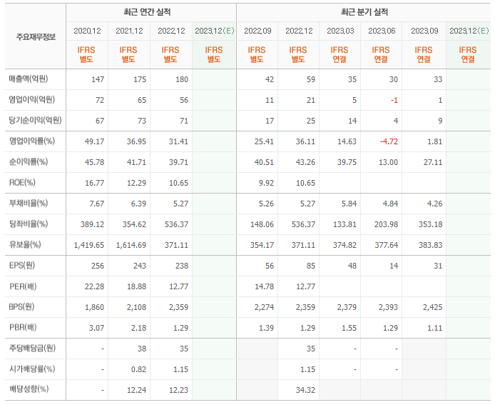 2022년 매출은 180억, 영업이익은 56억, 당기순이익은 71억입니다. 그리고 영업이익률은 31.41%입니다.