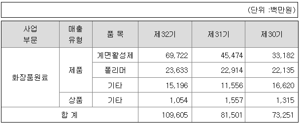 생활용품(샴푸, 린스, 화장품 등)원재료 소재산업은 제품이 갖는 경기변동이 타업종에 비하여 상대적으로 덜 민감합니다. 향후 큰 변동없는 완만한 성장과 안정세를 유지할 것으로 전망되며 해외시장에서는 다국적 기업과의 경쟁이 예상되나, 신흥시장(중국, 인도, 아프리카)의 생성과 당사의 품질개발로 인한 경쟁력 강화에 따라 세계시장 점유율은 점차 높아질 것으로 예상됩니다.