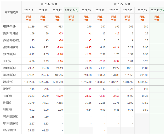 2022년 매출은 953억, 영업이익은 -23억, 당기순이익은 -26억입니다. 그리고 영업이익률은 -2.40%입니다.