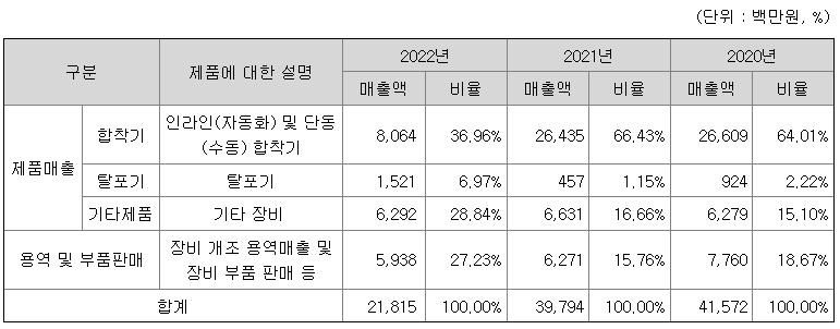 당사는 디스플레이제조장비 등을 개발하여 국내외 기업에 제작 판매하는 사업을 영위하고 있습니다. 특히 세계최초로 2004년에는 미세기포를 제거하는 매엽식 탈포기(STA), 2015년에는 곡면(3D) 형태의 디스플레이 패널을 합착할 수 있는 곡면 진공합착기(3D Laminator) 등을 개발하여 국내외기업으로부터 기술력을 인정받았습니다. 열 진공 압력을 이용하는 당사의 핵심 합착기술을 바탕으로 수소연료전지 제조장비, 기타 제조장비 등으로 제품군을 다양화하여 새로운 성장동력을 확보하고자 합니다.