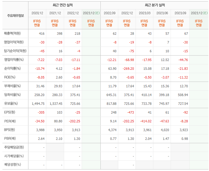 2022년 매출은 218억, 영업이익은 -37억, 당기순이익은 -4억입니다. 그리고 영업이익률은 -17.11%입니다.