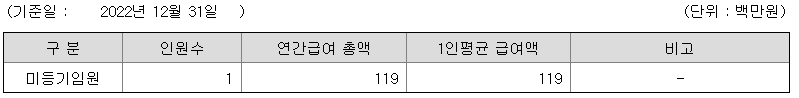미등기임원의 평균연봉은 1억 1900만원이고 직원수는 1명입니다.