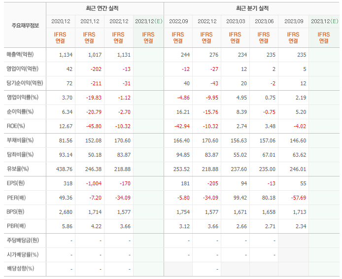 2022년 매출은 1131억, 영업이익은 -13억, 당기순이익은 -31억입니다. 그리고 영업이익률은 -1.12%입니다.