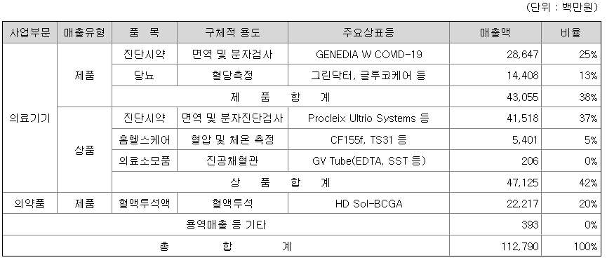 당사는 체외진단용의약품 및 의료기기 제조판매업, 의약품 및 의약부외품 제조판매업 등을 사업목적으로 하여 2003년 12월 29일에 설립된 법인입니다. 당사가 영위하고 있는 사업은 크게 진단시약, 혈액투석액, 당뇨 3개 사업부문으로 구성되어 있습니다.