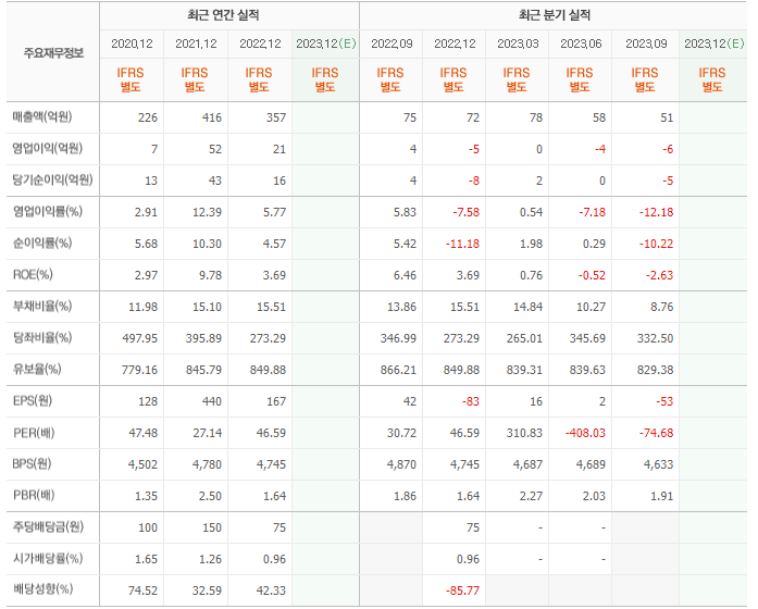 2022년 매출은 357억, 영업이익은 21억, 당기순이익은 16억입니다. 그리고 영업이익률은 5.77%입니다.