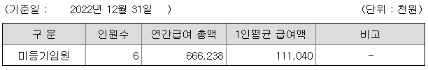미등기임원의 평균연봉은 1억 1104만원이고 직원수는 6명입니다.