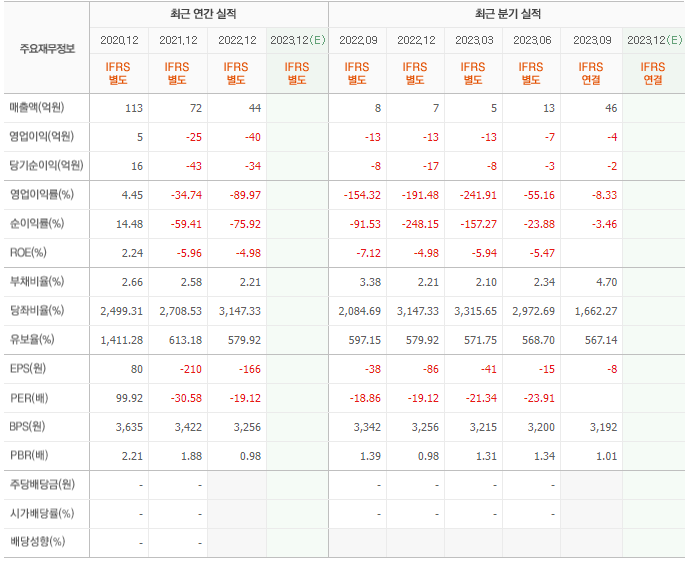 2022년 매출은 44억, 영업이익은 -40억, 당기순이익은 -34억입니다. 그리고 영업이익률은 -89.97%입니다.