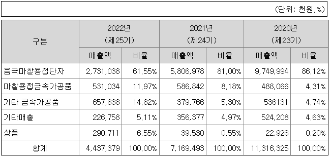 가. 주요 제품 등의 매출 현황