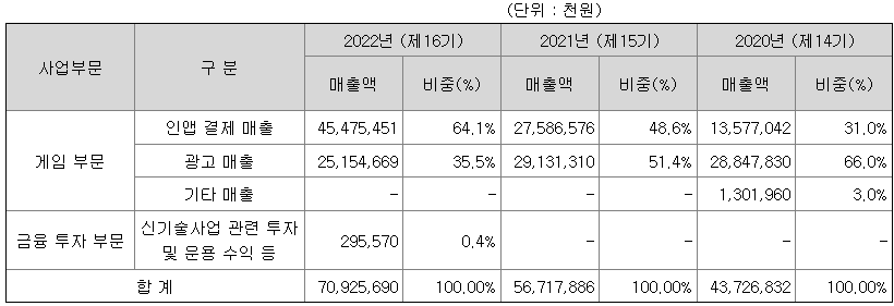 당사는 사업 구조상 게임 소프트웨어의 공급 및 서비스를 주요 사업으로 영위하고 있어 일반 제조업과 같은 제품을 판매하고 있지 않습니다. 사용자에게 게임 내 재화를 판매하는 '인앱 결제 매출', 광고를 사용자에게 노출시킨 대가로 매출을 발생시키는 '광고 (수익화) 매출'이 있으며, 기타 계약 및 라이선스 판매를 통한 '기타 매출'로 나눌 수 있습니다.