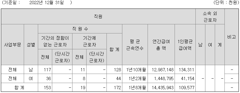 남성의 평균연봉은 1억 3431만원이고 직원수는 128명, 여성은 4115만원이고 직원수는 44명입니다. 전체 평균연봉은 1억 957만원이고 직원수는 172명입니다.