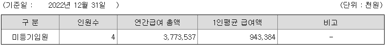 미등기임원의 평균연봉은 9억 4338만원이고 직원수는 4명입니다.