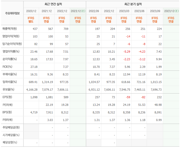 2022년 매출은 709억, 영업이익은 53억, 당기순이익은 57억입니다. 그리고 영업이익률은 7.51%입니다.