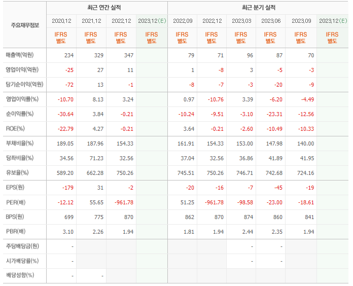 2022년 매출은 347억, 영업이익은 11억, 당기순이익은 -1억입니다. 그리고 영업이익률은 3.24%입니다.